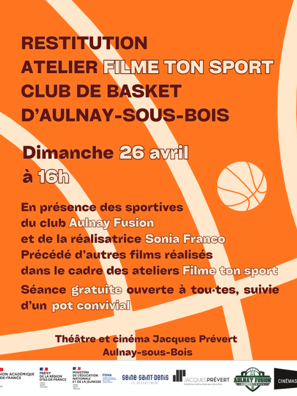 Vous êtes ici : Accueil > Agenda > Loisirs > Culture > Par structures > Théâtre & cinéma Jacques Prévert > Restitution FILME TON SPORT Restitution FILME TON SPORT Théâtre & cinéma Jacques Prévert 26/04/2026 RESTITUTION - FILME TON SPORT À Aulnay, Cinéma 93 a mené l’atelier de réalisation Filme ton sport. Pendant un mois, la réalisatrice Sonia Nunes a suivi l’équipe féminine du Basket Aulnay Fusion, donnant naissance à un court-métrage coécrit et interprété par les joueuses. Les 15 basketteuses vous donnent rendez-vous pour présenter leur film qui sera accompagné d’autres réalisations sportives du territoire consacrées notamment à l’athlétisme et à la gymnastique. La projection sera suivie d’un pot convivial. Entrée libre Horaires DIMANCHE 26 AVRIL À 16H Tarifs Entrée libre Horaires Théâtre et Cinéma Jacques Prévert 134 Avenue Anatole France 93600 Aulnay-sous-Bois Partager Partager sur FacebookPartager sur TwitterPartager sur Google+ImprimerEnvoyer à un ami Retour à la liste Sur le même thème... Voir tout l'agenda 23/04/2026 Théâtre & cinéma Jacques Prévert Ciné-Rencontre : Plus fort que moi 25/04/2026 Théâtre & cinéma Jacques Prévert Ciné Jeunes Ambassadeurs: Les Bureaux de Dieu 26/04/2026 Théâtre & cinéma Jacques Prévert Retransmission Comédie Française : Le Cid