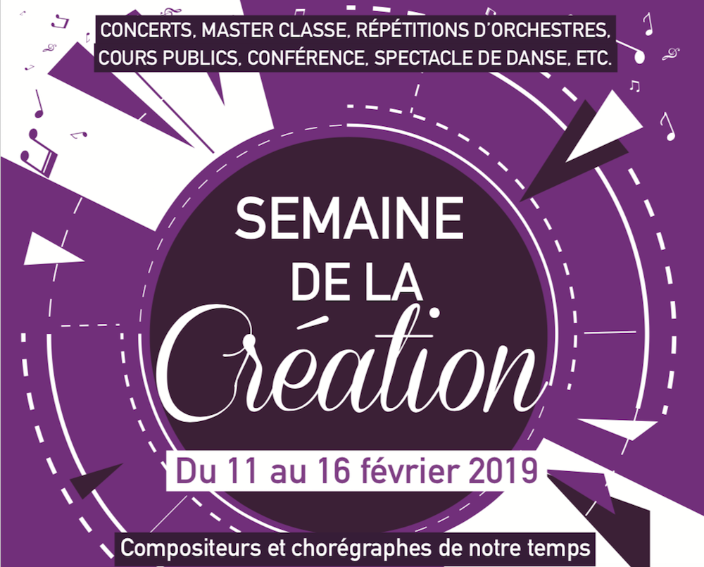 Vous êtes ici : Accueil > Agenda > Loisirs > Culture > Par type > Musique et concert > Semaine de la création Lundi 11 février : 17h - Cours sur « Les techniques d'écriture dans la musique de Tōru TAKEMITSU et de György LIGETI » Donné par Xavier Medina-Martin. durée : 1h30 environ Salle Fauré 18h - « Carte blanche aux étudiants ». Avec la participation d’étudiants du Pôle Sup'93 et du CRD. durée : 1h environ Auditorium Mozart 19h – Cours de présentation de l’œuvre pour piano Amores de John CAGE Avec Solène Adjovi, Amandine Annoni et Angélina Rigo-Druesne - classe d'Ariane Beaussart durée : 45 minutes environ Salle Ravel Semaine de la création Musique et concert Du 11/02/2019 au 16/02/2019 En prélude de la Semaine de la création, le Mardi 5 février, Sébastien Rouillard fera son spectacle La Voix du Tuba dans lequel il interprétera plusieurs œuvres poétiques et musicales contemporaines. Tout au long de la semaine : nombreux concerts et cours publics sur les musiques d’aujourd’hui, compositeurs de notre temps, créations, œuvres marquantes dans l’évolution du langage musical et de la danse … Pierre Monty, professeur de flûte et de piccolo au CRD à l'initiative de ce projet sera l'invité de Marc Portehaut dans l’émission point d'orgue. Il présentera la Semaine de la création le jeudi 7 février à 13h sur 100.7. Pour écouter son intervention cliquez-ici Mardi 12 février :