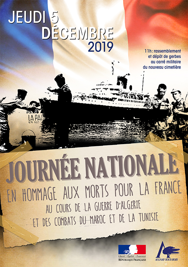 Vous êtes ici : Accueil > Agenda > Vie citoyenne > Commémorations > Hommage aux morts pour la France Hommage aux morts pour la France Commémorations 05/12/2019 Jeudi 5 décembre 2019 à 11h Journée nationale en hommage aux morts pour la France au cours de la Guerre d'Algérie et des combats du Maroc et de la Tunisie. 11h : Rassemblement et dépôt de gerbes au carré militaire du nouveau cimetière Partager Partager sur FacebookPartager sur TwitterPartager sur Google+ImprimerEnvoyer à un ami Retour à la liste